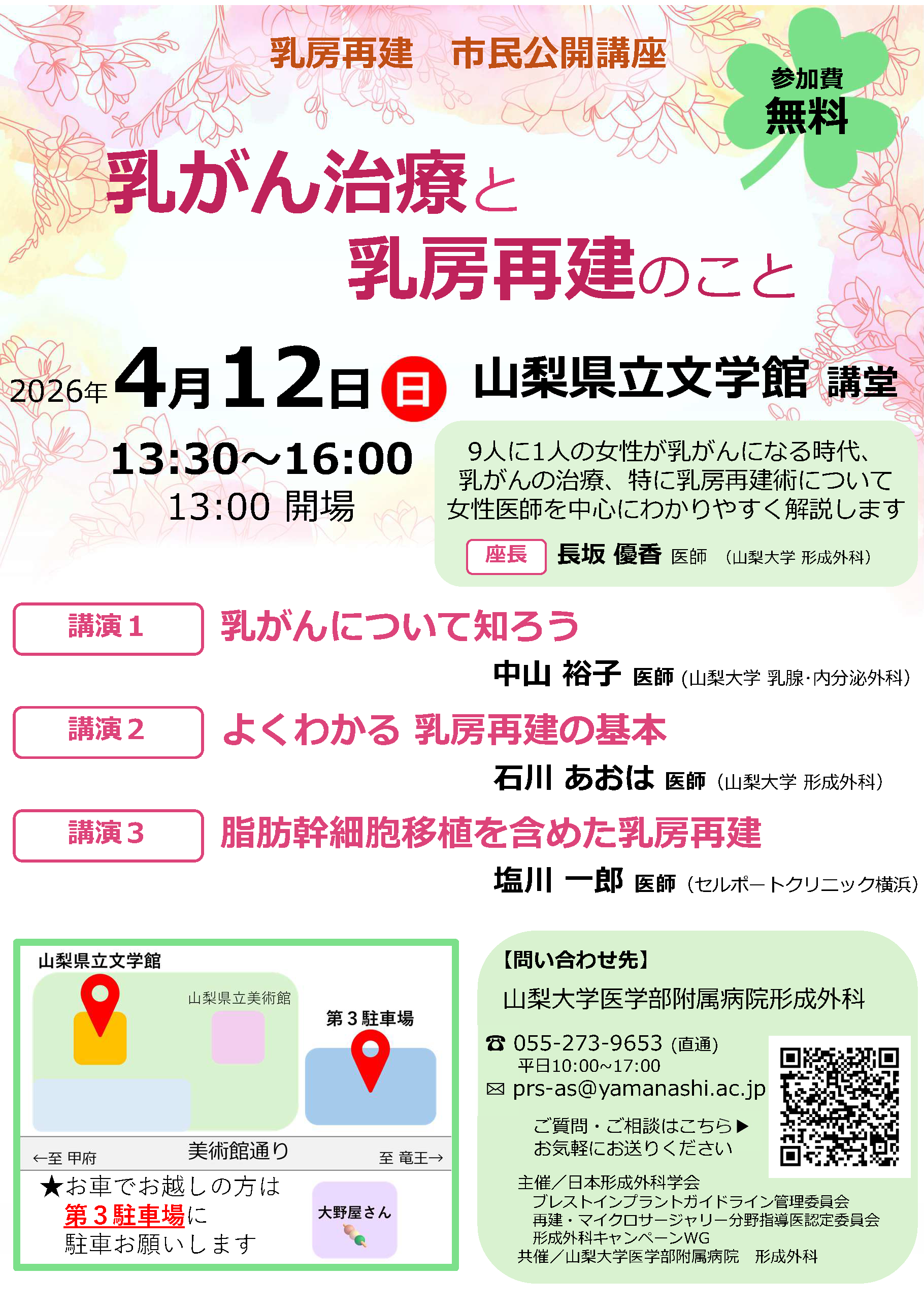 市民公開講座 乳癌と乳房再建を学ぼう お申し込みURL:https://pro.form-mailer.jp/fms/32a05d37346108 乳がん治療と乳房再建のこと 知っちょる?山口県の乳がんの今~乳がん検診から保険でできる乳房再建まで~ 過去に開催した講座